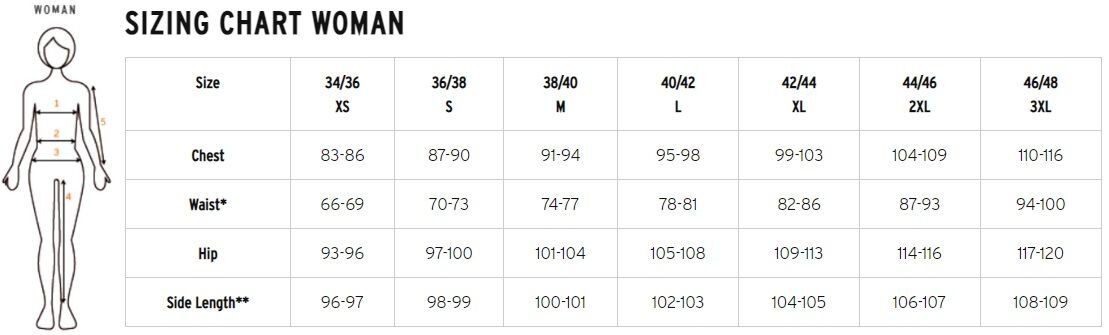 | 34/36 XS | 36/38 S | 38/40 M | 40/42 L | 42/44 XL | 44/46 XXL | 46/48 3XL |