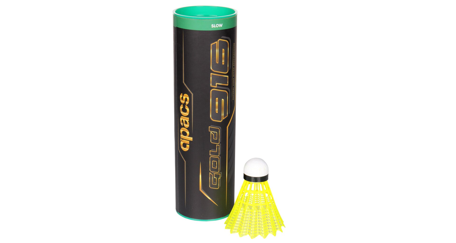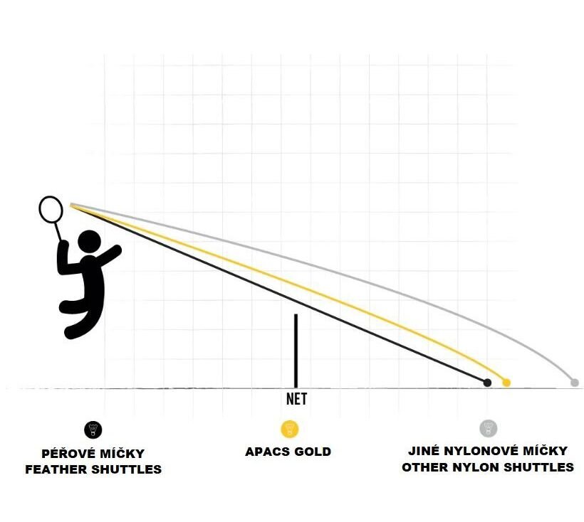 Badmintonové košíčky Gold 916 značky Apacs, která je známá zatím především v asijských zemích, kde je badminton národním sportem. Řada Apacs Gold je vyrobena z vysoce kvalitního materiálu pro nepřetržitou hru. Jsou testovány na 100% rotaci, nabízí stabilní let, rovnováhu, skvělou viditelnost a odolnost. Gold 916 jsou vyrobené z vysoce kvalitního nylonu žluté barvy s hlavičkou ze 100% full natural cork. Míčky jsou vhodné pro závodní hráče a sportovní kluby, ale díky své výhodné ceně si najdou příznivce i mezi začátečníky a rekreačními hráči. Tuba obsahuje 6 kusů.