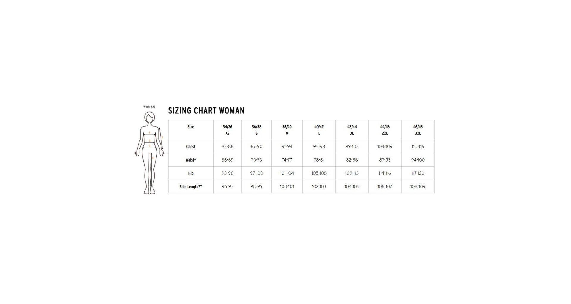 | 34/36 XS | 36/38 S | 38/40 M | 40/42 L | 42/44 XL | 44/46 XXL | 46/48 3XL |